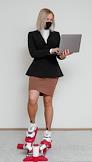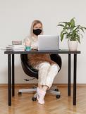 Москва во время режима самоизоляции из-за угрозы распространения коронавирусной инфекции COVID-19. Жанровая фотография. Женщина в медицинской маске за ноутбуками во время дистанционной работы, занимается одновременно на шаговом тренажере.