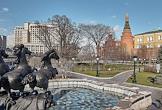 Москва во время режима самоизоляции из-за опасности распространения коронавирусной инфекцией COVID-19. Жанровая фотография. Фонтан "Четыре лошади" и вид на Александровский сад и здание Four Seasons Hotel ("Четыре сезона", бывшая гостиница "Москва").