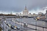 Москва во время режима самоизоляции из-за опасности распространения коронавирусной инфекцией COVID-19. Жанровая фотография. Жилой дом на Котельнической набережной, автомобили на Москворецкой набережной.