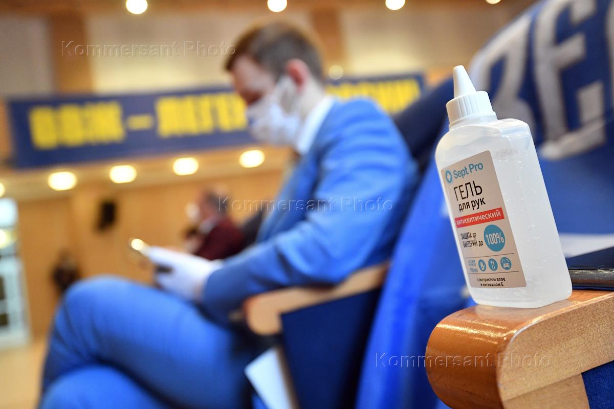День рождения лидера Либерально-демократической партии России (ЛДПР) Владимира Жириновского. Мероприятие, посвященное 74-летию лидера ЛДПР Владимира Жириновского. Жанровая фотография. Дезинфицирующий гель для рук на ручке кресла.