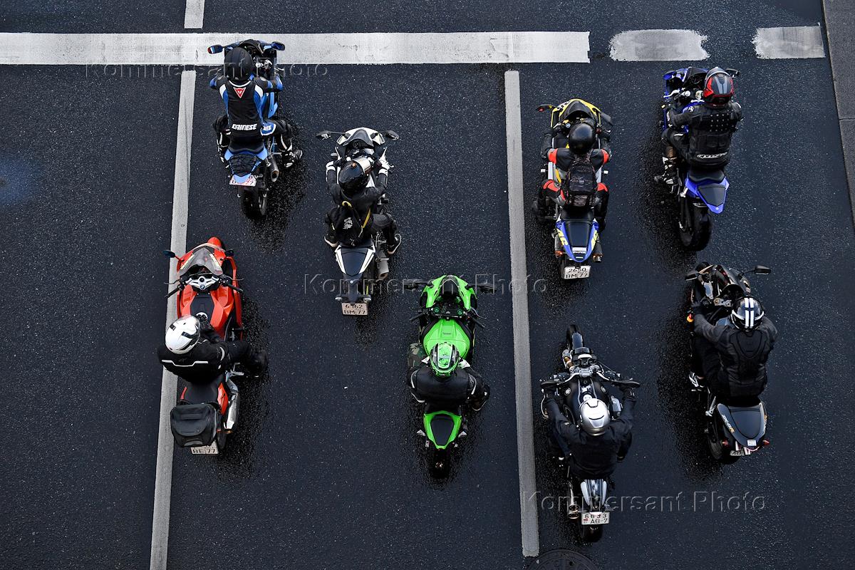 Москва во время режима самоизоляции из-за опасности распространения коронавирусной инфекции COVID-19. Жанровая фотография. Группа мотоциклистов на дороге перед светофором.