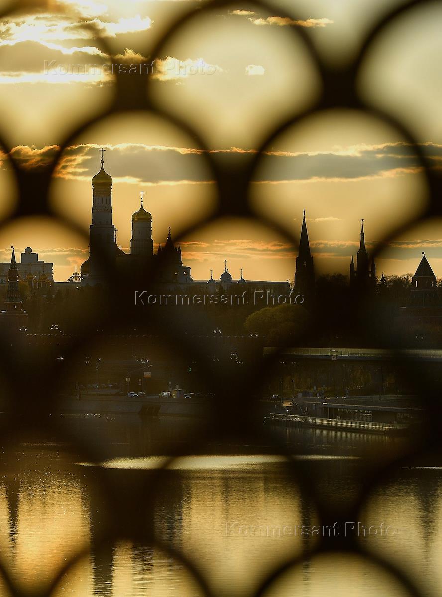 Москва во время режима самоизоляции из-за опасности распространения коронавирусной инфекции COVID-19. Жанровая фотография. Вид на Московский Кремль сквозь решетку моста.