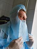 Новосибирск во время режима карантина из-за опасности распространения коронавирусной инфекции COVID-19. Жанровая фотография. Работа Ленинской подстанции станции скорой медицинской помощи. "Ковидная" бригада готовится к выезду к пациенту с подтвержденным диагнозом Covid-19. Сотрудник скорой помощи надевает защитный костюм.