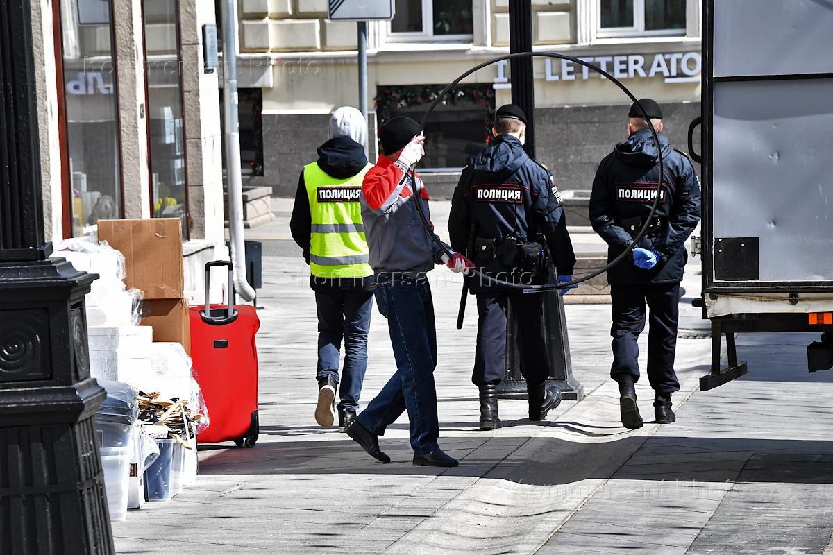 Москва во время режима самоизоляции из-за опасности распространения коронавирусной инфекции COVID-19. Жанровая фотография. Новая площадь. Грузчики во время работы.