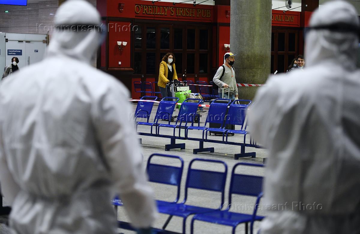 Международный аэропорт Пулково во время режима карантина из-за опасности распространения коронавирусной инфекции COVID-19. Жанровая фотография. Прилет рейса с российскими туристами из Тель-Авива в аэропорт "Пулково". Сотрудники аэропорта в защитных костюмах в здании аэропорта.
