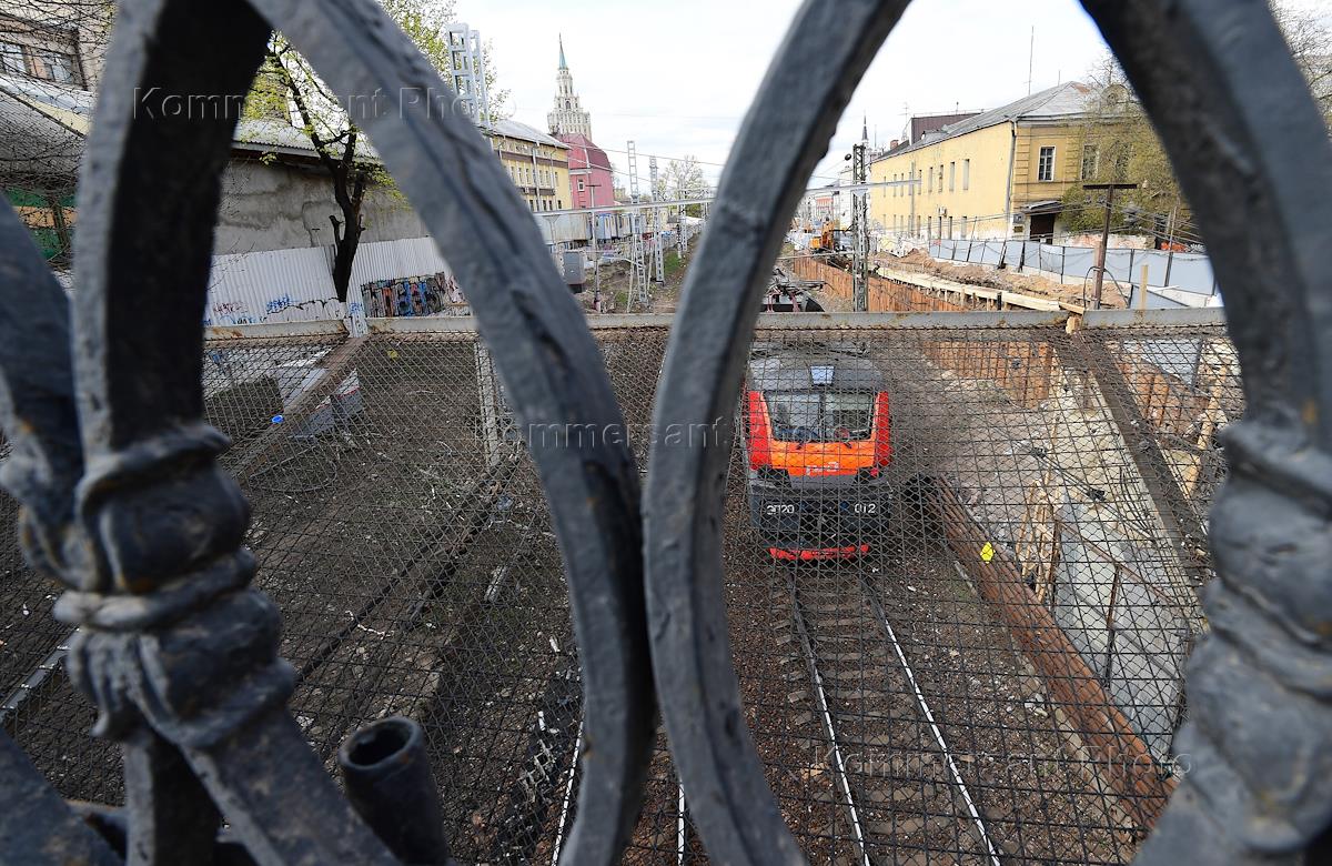 Москва во время режима самоизоляции из-за опасности распространения коронавирусной инфекции COVID-19. Жанровая фотография. Строительство линии МЦД-4 на участке Москва-Курская - Москва-Каланчёвская. Поезд МЦД на железнодорожных путях.