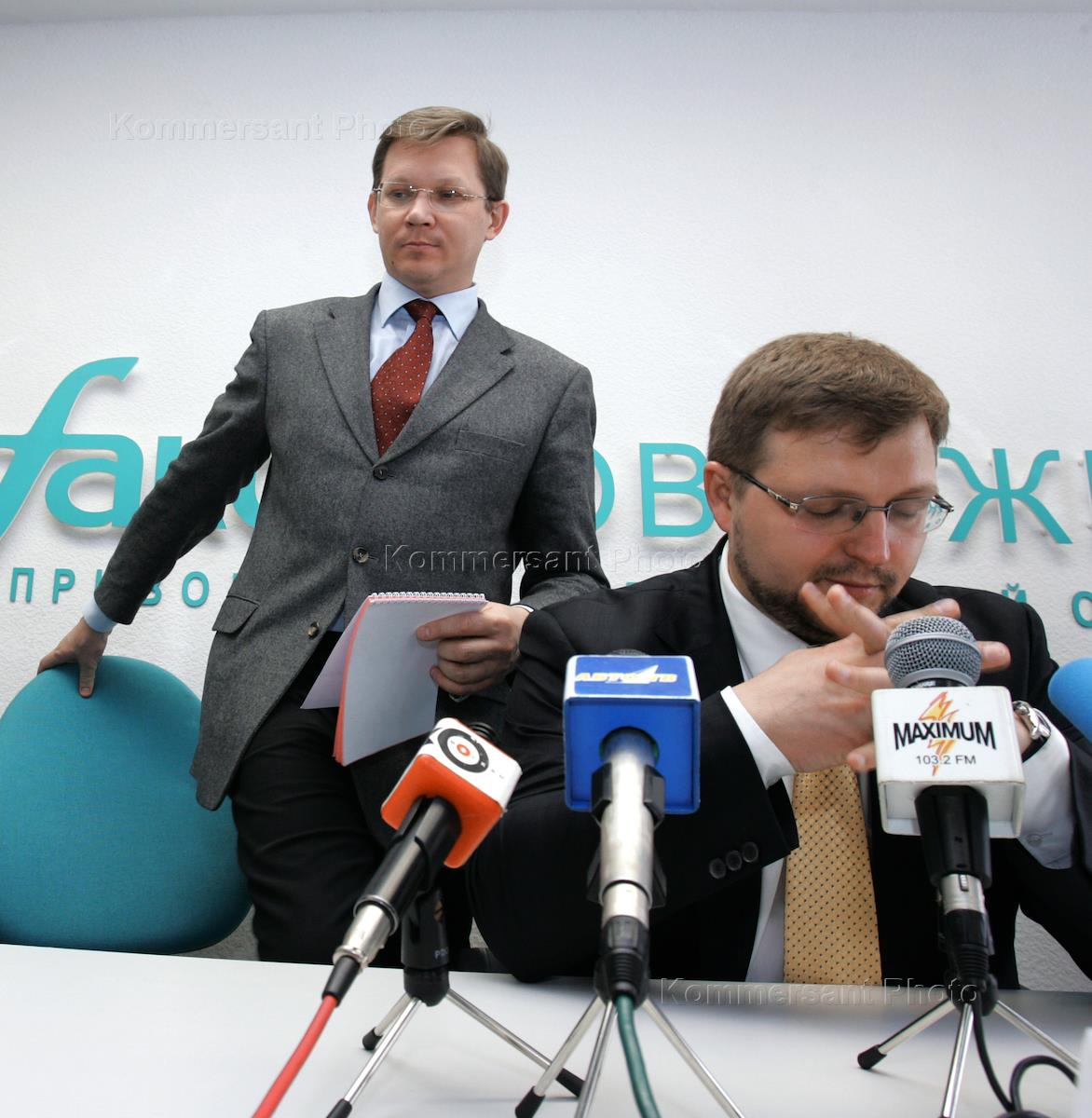 Член Комитета Государственной Думы России по делам Федерации и региональной политике Владимир Рыжков (слева) и лидер Федерального политсовета партии "Союз Правых Сил" (СПС) Никита Белых (справа) во время пресс-конференции, посвященной Общественному форуму "Парламентаризм. Демократия. Право". Форум приурочен сразу к трем датам - столетию парламентаризма в России, 30 - летию МХГ и 85 - летию со дня рождения академика Андрея Сахарова. Пресс-конференция прошла в агентстве "Интерфакс".