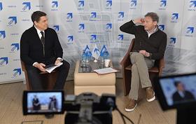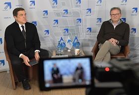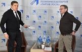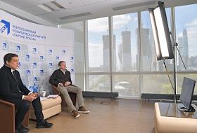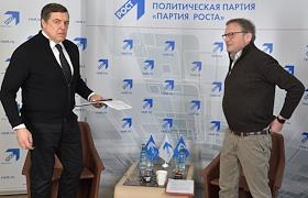 Режим самоизоляции из-за опасности распространения коронавирусной инфекции COVID-19. Жанровая фотография. Онлайн-митинги, приуроченные к 1 Мая. Онлайн-митинг "Хотим работать", организованный "Партией Роста" на YouTube-канале "Люди Роста". Заместитель председателя "Партии Роста", продюсер Александр Любимов (слева) и председатель "Партии Роста", уполномоченный при президенте России по защите прав предпринимателей Борис Титов (справа) в офисе "Партии Роста" во время проведения онлайн-митинга.