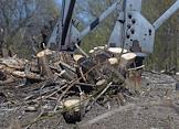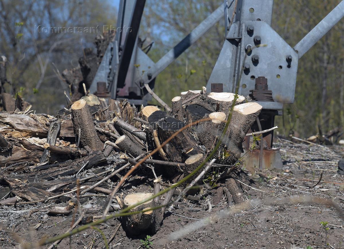 Москва во время режима самоизоляции из-за опасности распространения коронавирусной инфекции COVID-19. Жанровая фотография. Первое мая в парках города. Срубленное дерево у опоры линии электропередач (ЛЭП).
