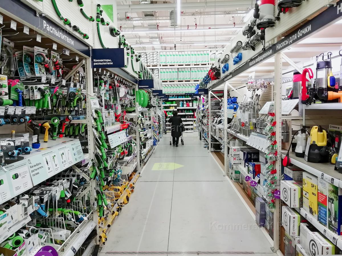 Москва во время режима самоизоляции из-за опасности распространения коронавирусной инфекции COVID-19. Жанровая фотография. Витрина с товаром в магазине Leroy Merlin (Леруа Мерлен).