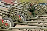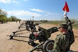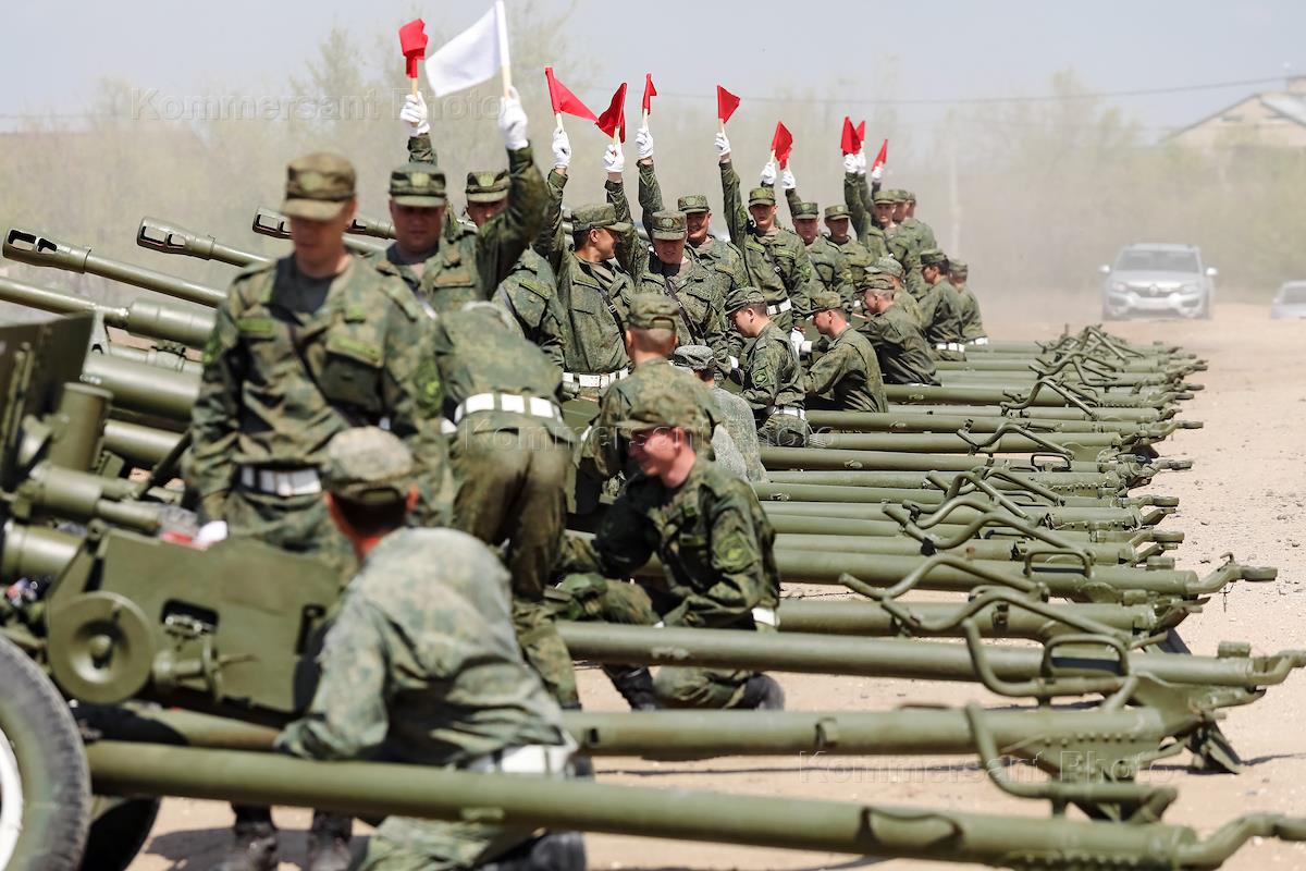 Подготовка к празднованию 75-летия Великой Победы. Салютные расчеты артиллерии соединения Южного военного округа (ЮВО) Вооруженных Сил России во время отработки порядка действий при выполнении выстрелов из орудий времен Великой Отечественной войны 12-ти 76-мм легендарных дивизионных пушек ЗИС-3 холостыми боеприпасами для звукового сопровождения салютных установок 2А85.