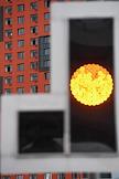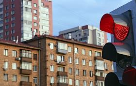 Жанровая фотография. Красный сигнал светофора на фоне жилых домов.