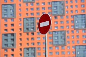 Жанровая фотография. Дорожный знак "проезд запрещен" и новый многоэтажный жилой дом.