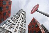Жанровая фотография. Дорожный знак "проезд запрещен" среди зданий жилого многоэтажного комплекса.