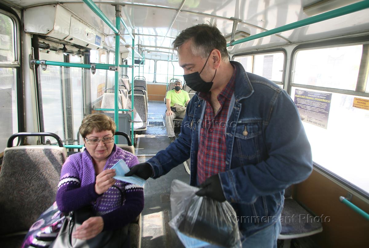 Ростов-на-Дону во время режима самоизоляции из-за опасности распространения коронавирусной инфекции COVID-19. Жанровая фотография. Раздача одноразовых медицинских масок пассажирам в общественном транспорте.