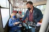 Ростов-на-Дону во время режима самоизоляции из-за опасности распространения коронавирусной инфекции COVID-19. Жанровая фотография. Раздача одноразовых медицинских масок пассажирам в общественном транспорте.