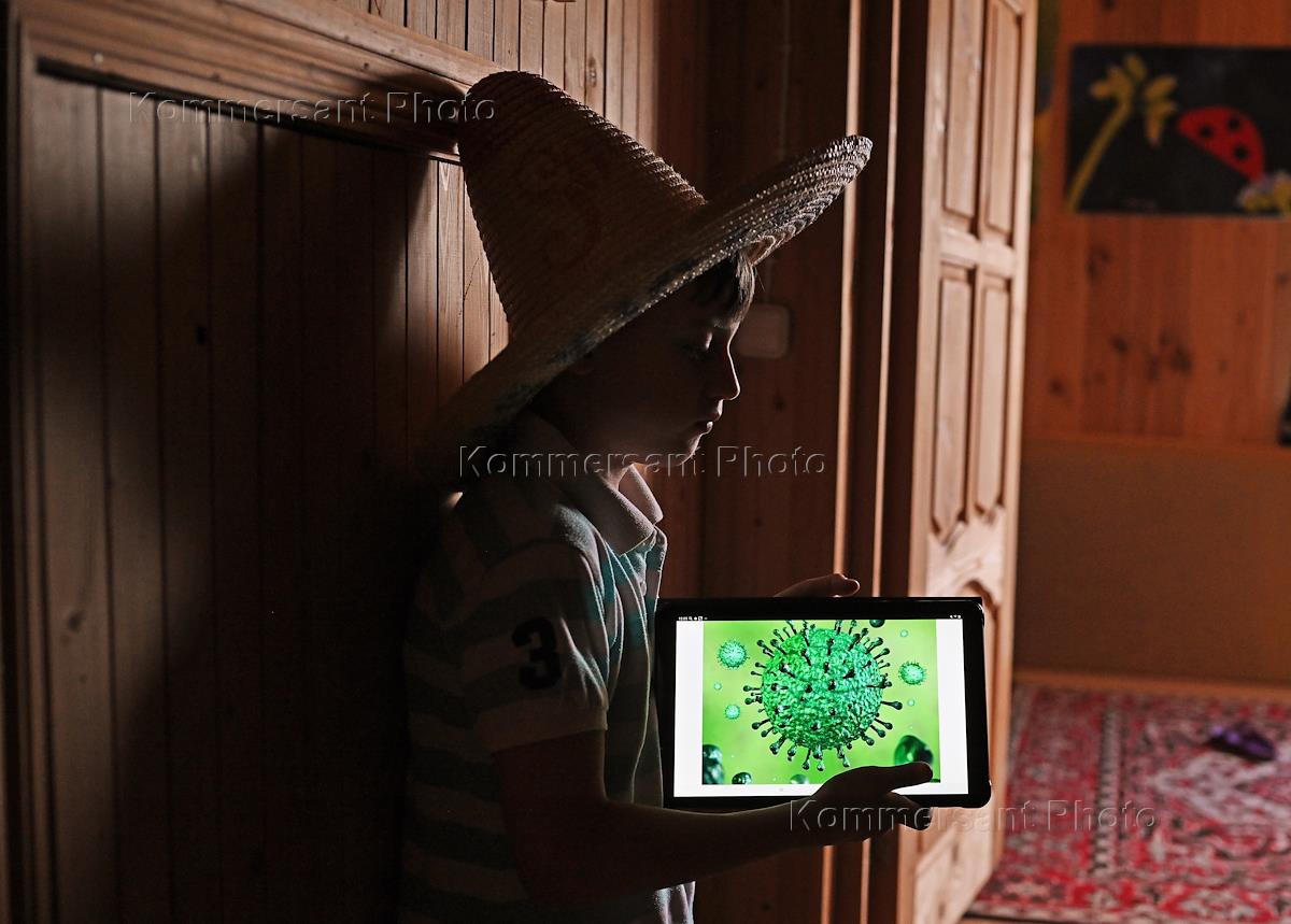 Москва во время режима самоизоляции из-за опасности распространения коронавирусной инфекции COVID-19. Жанровая фотография. Экран компьютера на фоне мальчика в шляпе сомбреро.
