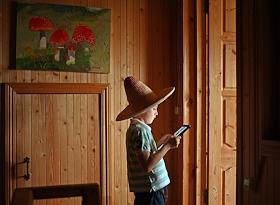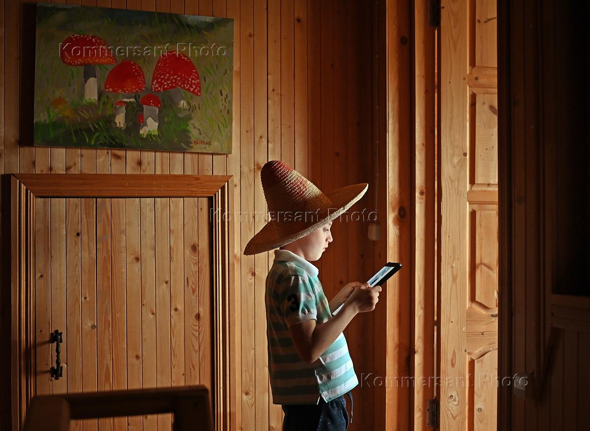 Москва во время режима самоизоляции из-за опасности распространения коронавирусной инфекции COVID-19. Жанровая фотография. Мальчик в шляпе сомбреро с планшетом в руках.