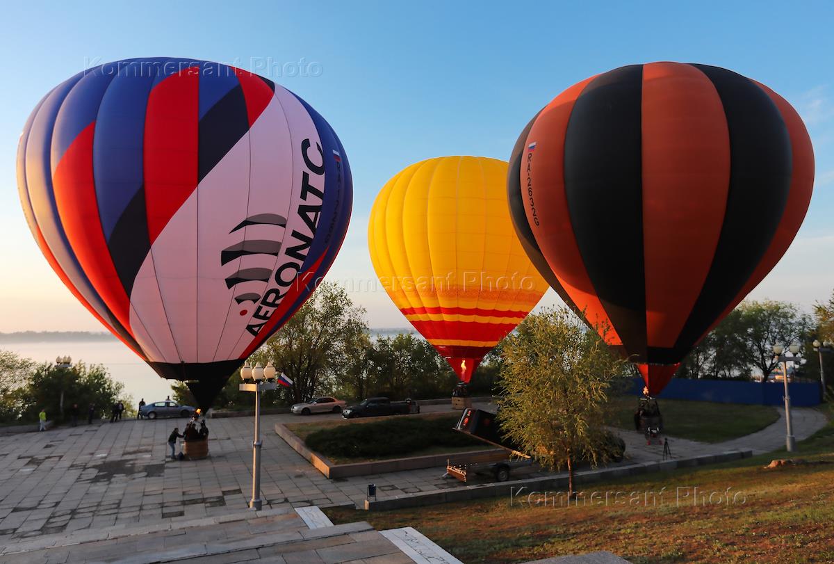 Волгоград во время режима самоизоляции из-за опасности распространения коронавирусной инфекции COVID-19. Жанровая фотография. Подготовка к акции, которая состоится 9 мая. Тестовый запуск трех аэростатов. Старт аэростатов на площади у музея-панорамы "Сталинградская битва".