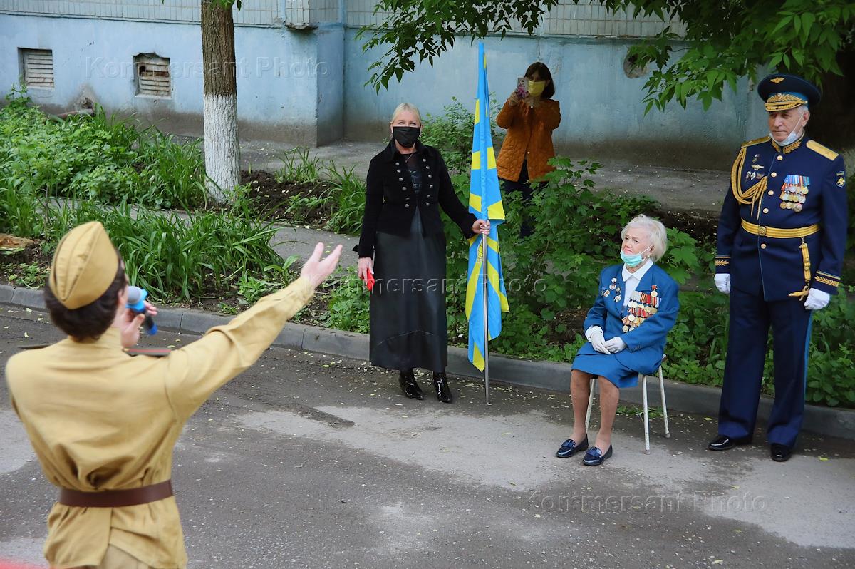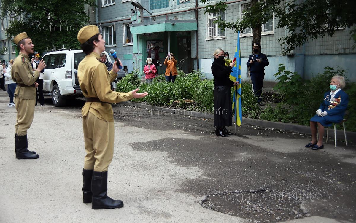 Поздравление ветерана Великой Отечественной войны Елены Наумовны Горбачевой с 75-ой годовщиной победы в Великой Отечественной войне и с 95-летием со дня рождения. Артисты концертного ансамбля "Успех" окружного дома офицеров ЮВО выступили с творческой программой перед ветераном. Зрители в медицинских масках снимают на мобильные телефоны выступление ансамбля.