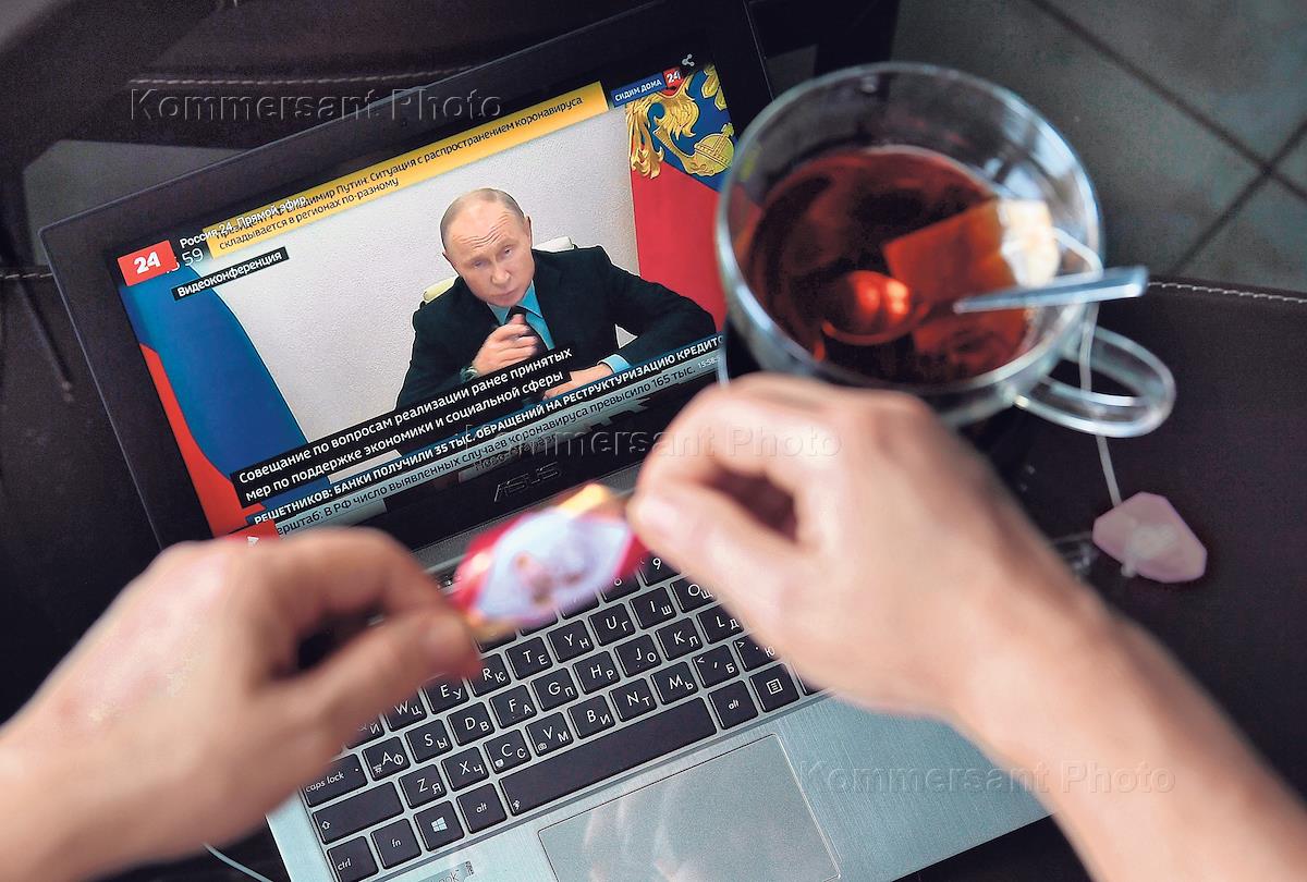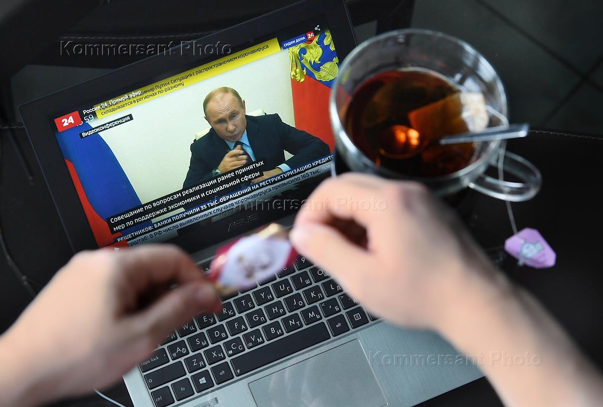 Трансляция совещания президента России Владимира Путина в режиме видеоконференции по реализации принятых решений по борьбе с коронавирусом в стране. Жанровая фотография.