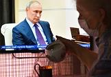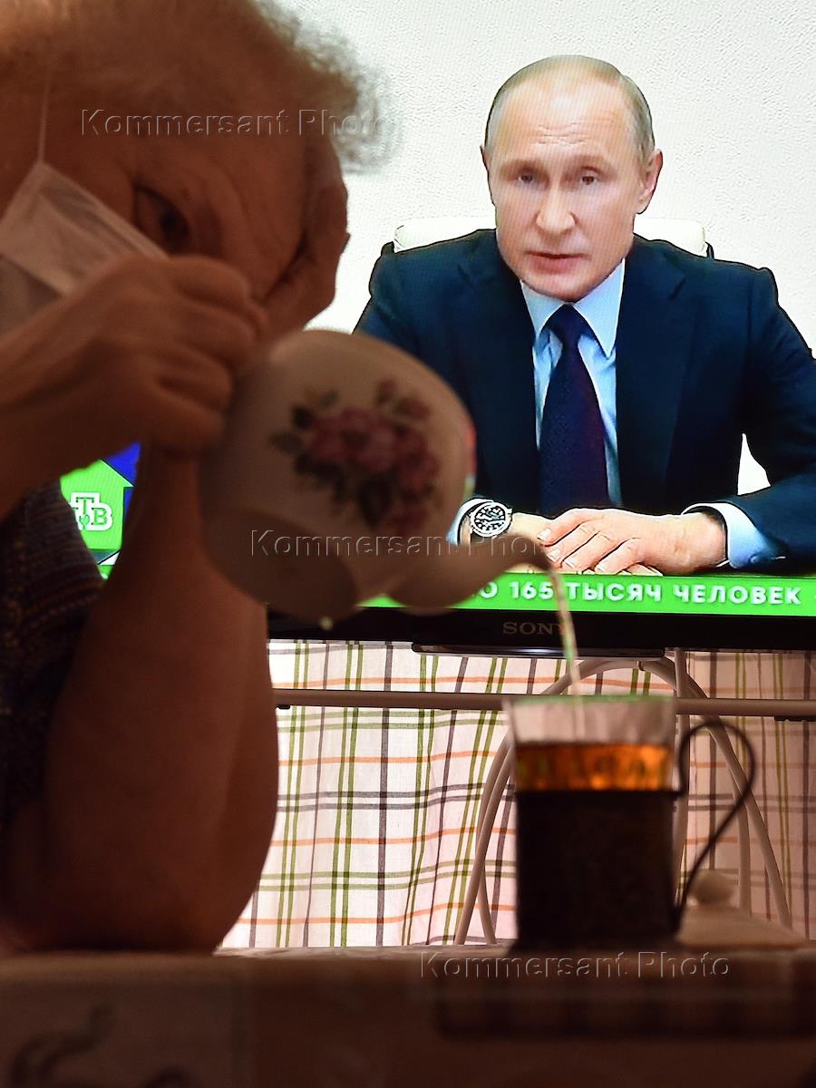 Трансляция совещания президента России Владимира Путина в режиме видеоконференции по реализации принятых решений по борьбе с коронавирусом в стране. Жанровая фотография. Женщина в медицинской маске с заварным чайником на фоне телевизионной трансляции.