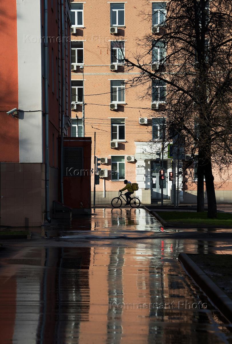Москва во время режима самоизоляции из-за опасности распространения коронавирусной инфекции COVID-19. Жанровая фотография. Курьер службы доставки "Яндекс. Еда" на Новослободской улице.