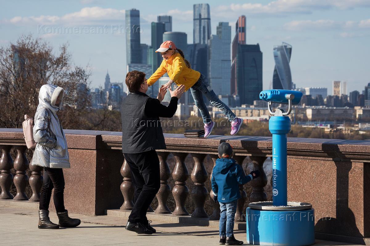 Москва во время режима самоизоляции из-за опасности распространения коронавирусной инфекции COVID-19. Жанровая фотография. Семья во время прогулки на Воробьевых горах.