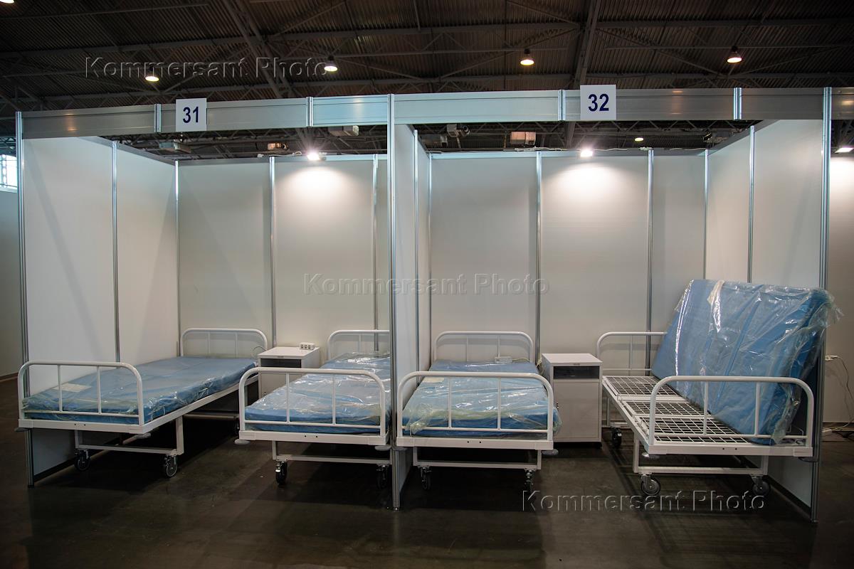 Мобильный инфекционный госпиталь для зараженных коронавирусной инфекцией COVID-19 в 7-м павильоне выставочного комплекса "Ленэкспо".