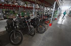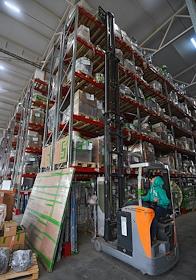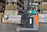Сервис хранения вещей "Чердак". Сотрудник склада во время работы на автопогрузчике.