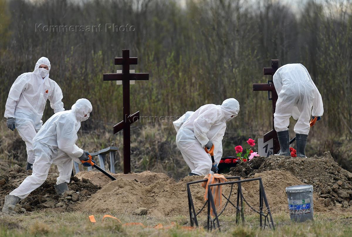 Санкт-Петербург во время режима самоизоляции из-за опасности распространения коронавирусной инфекции COVID-19. Похороны погибшей от COVID-19 женщины на специальном участке Нового Колпинского кладбища. Сотрудники кладбища в защитных костюмах во время церемонии погребения.