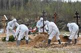 Санкт-Петербург во время режима самоизоляции из-за опасности распространения коронавирусной инфекции COVID-19. Похороны погибшей от COVID-19 женщины на специальном участке Нового Колпинского кладбища. Сотрудники кладбища и ритуальной службы в защитных костюмах во время погребения.