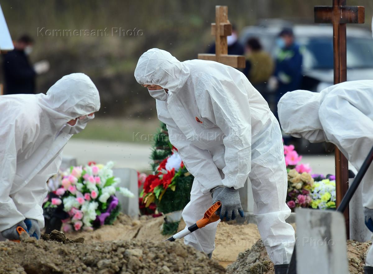 Санкт-Петербург во время режима самоизоляции из-за опасности распространения коронавирусной инфекции COVID-19. Похороны погибшей от COVID-19 женщины на специальном участке Нового Колпинского кладбища. Сотрудники кладбища в защитных костюмах во время церемонии погребения.