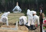 Новое Колпинское кладбище. Сотрудники кладбища в защитных костюмах после захоронения гроба с телом умершей от COVID-19 в могилу на специальном участке кладбища.