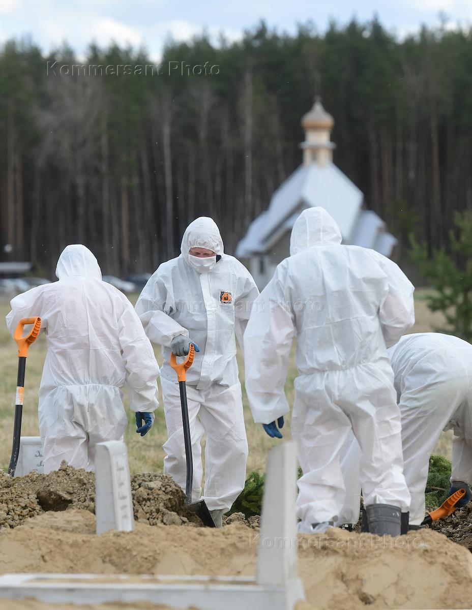 Санкт-Петербург во время режима самоизоляции из-за опасности распространения коронавирусной инфекции COVID-19. Похороны погибшей от COVID-19 женщины на специальном участке Нового Колпинского кладбища. Сотрудники кладбища в защитных костюмах во время церемонии погребения.
