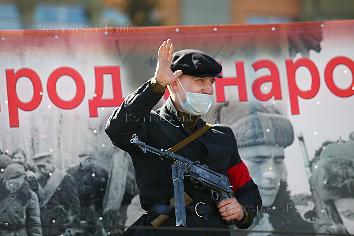 Екатеринбург во время режима самоизоляции из-за опасности распространения коронавирусной инфекции COVID-19. Празднование 75-ой годовщины Победы в Великой Отечественной войне. Жанровая фотография. Участники реконструкции сценок времен Великой отечественной войны в колонне грузовиков на Площади 1905 года.