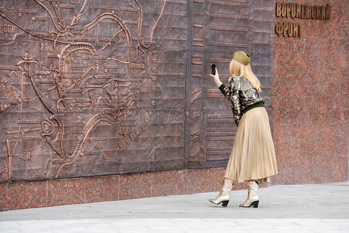 Воронеж во время режима самоизоляции из-за опасности распространения коронавирусной инфекции COVID-19. Празднование 75-ой годовщины Победы в Великой Отечественной войне. Девушка фотографирует на телефон карту боев на Воронежском фронте на площади Победы.