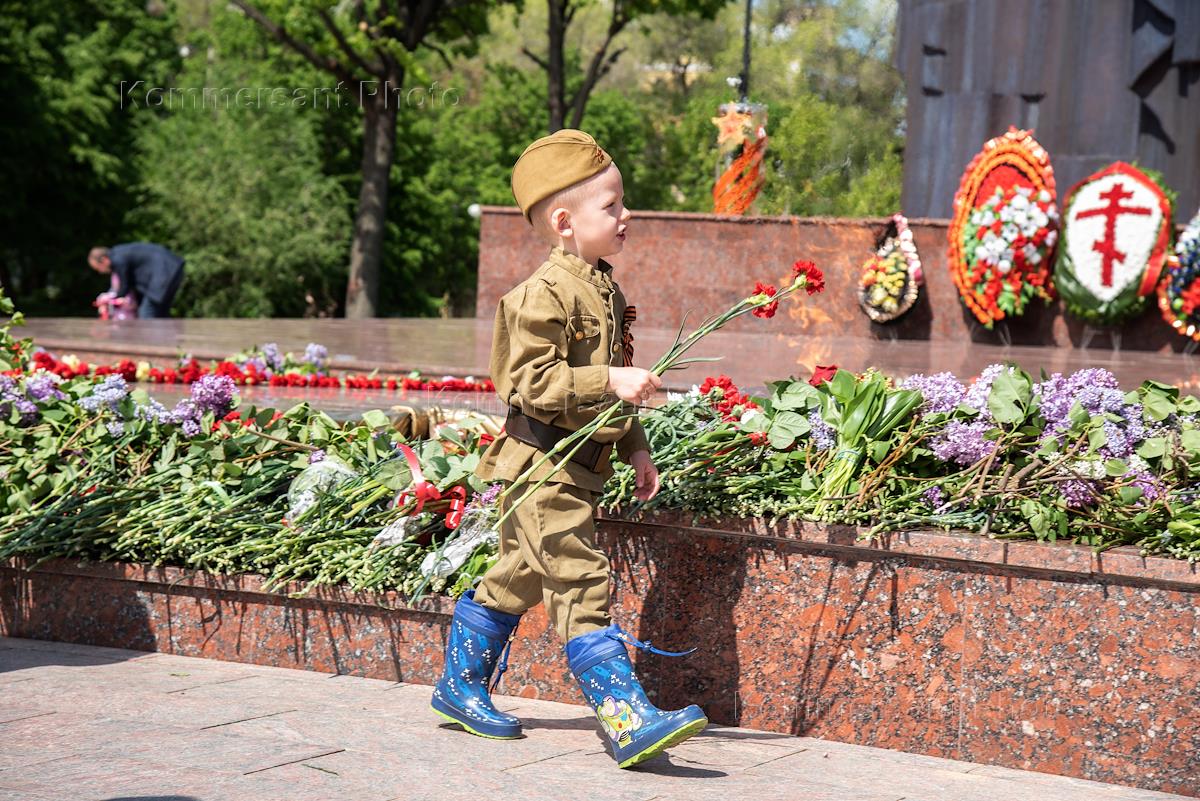 Воронеж во время режима самоизоляции из-за опасности распространения коронавирусной инфекции COVID-19. Празднование 75-ой годовщины Победы в Великой Отечественной войне. Маленький мальчик в военной форме с цветами в руках возле мемориала на Площади Победы.