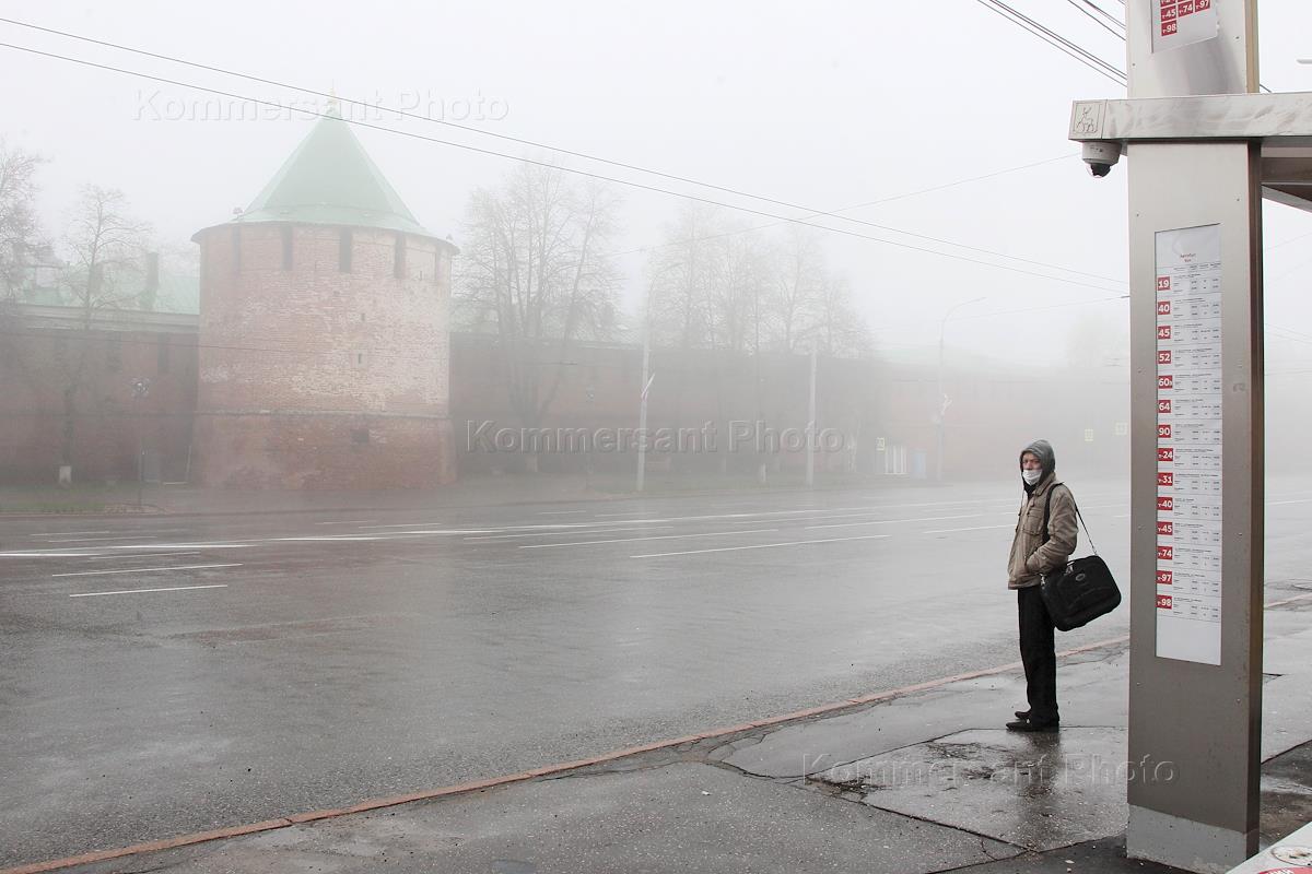 Нижний Новгород во время режима самоизоляции из-за опасности распространения коронавирусной инфекции COVID-19. Празднование 75-ой годовщины Победы в Великой Отечественной войне. Жанровая фотография. Мужчина в медицинской маске ждет автобуса на остановке напротив Нижегородского кремля.