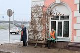 Нижний Новгород во время режима самоизоляции из-за опасности распространения коронавирусной инфекции COVID-19. Жанровая фотография. Сотрудники коммунальных служб у залитой грязью стены здания ликвидируют последствия ливневых осадков.