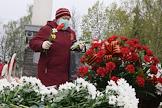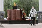 Нижний Новгород во время режима самоизоляции из-за опасности распространения коронавирусной инфекции COVID-19. Празднование 75-ой годовщины Победы в Великой Отечественной войне. Жанровая фотография. Пенсионерка в медицинской маске возлагает цветы к Вечному огню.