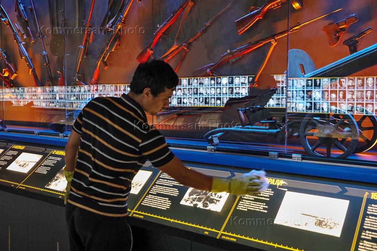 Празднование 75-ой годовщины Победы в Великой Отечественной войне. Завершение строительства музейного комплекса "Дорога памяти". Сотрудник комплекса в медицинской маске в Галерее "Дорогой памяти".
