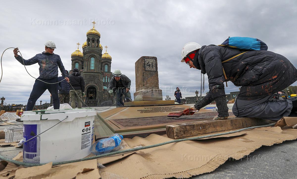 Празднование 75-ой годовщины Победы в Великой Отечественной войне. Храм Воскресения Христова - главный храм Вооруженных сил России в военно-патриотическом парке культуры и отдыха Вооруженных Сил России "Патриот". Рабочие во время благоустройства территории вокруг храма.