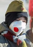 Празднование 75-ой годовщины Победы в Великой Отечественной войне. Воздушный парад, посвященный 75-й годовщине Победы в Великой Отечественной войне. Мальчик в военной пилотке и защитной маске наблюдает за воздушным парадом.