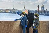 Санкт-Петербург во время режима самоизоляции из-за опасности распространения коронавирусной инфекции COVID-19. Празднование 75-ой годовщины Победы в Великой Отечественной войне. Жанровая фотография. Мужчина с детьми смотрит воздушный часть военного Парада с набережной реки Невы.