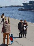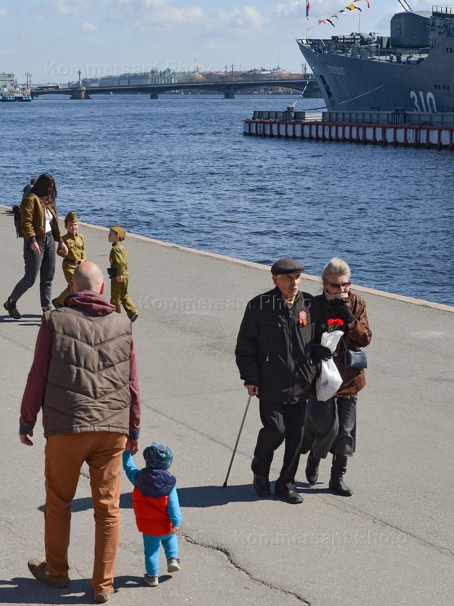 75-я годовщина Победы в Великой Отечественной войне. Санкт-Петербург во время режима самоизоляции из-за опасности распространения коронавирусной инфекции COVID-19. Жанровая фотография. Пожилые люди на набережной на фоне крейсера "Аврора".