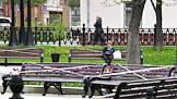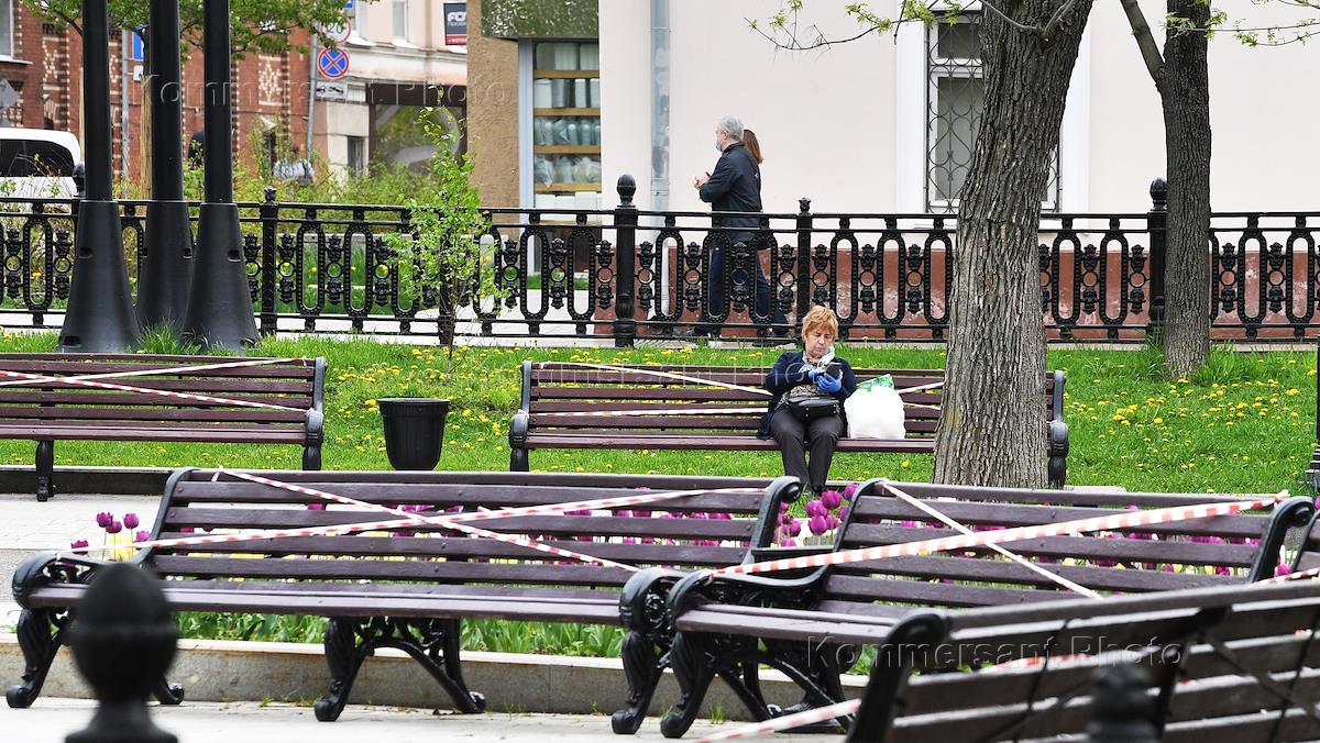 Moscow during self-isolation regime caused by the danger of the coronavirus COVID-19 spread. Introduction of the mandatory wearing of masks and gloves in public transport starting from May 12. Genre photo. Woman sitting on a boulevard bench that is blocked with barricade tape.