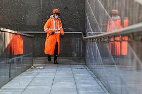 Moscow during self-isolation regime caused by the danger of the coronavirus COVID-19 spread. Introduction of the mandatory wearing of masks and gloves in public transport starting from May 12. Genre photo. Municipal worker wearing face mask and special suit disinfects the underground passage.