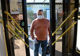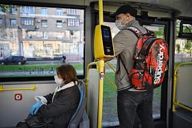 Moscow during self-isolation regime caused by the danger of the coronavirus COVID-19 spread. Introduction of the mandatory wearing of masks and gloves in public transport starting from May 12. Genre photo. Man wearing face mask and gloves gets on the bus.
