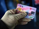 Moscow during self-isolation regime caused by the danger of the coronavirus COVID-19 spread. Introduction of the mandatory wearing of masks and gloves in public transport starting from May 12. Genre photo. Hand in rubber glove holding Muskovite's Social Card.